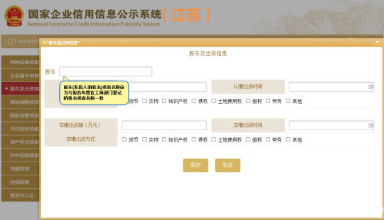 4、 填写股东及出资信息,点击“添加”进行填写。(分公司无需填写)按照公司章程上约定的填写股东出资额及出资时间,每一个股东(发起人)的出资信息只需填报一条,股东(发起人)认缴和实缴出资额为截至报告年度12月31日的累计数额;认缴和实缴出资时间为截至报告年度12月31日最后一次认缴和实缴时间,出资方式可以多选。点击“保存”。如还未发生实缴,则实缴部分暂时不需填写,填写认缴信息后即可保存。注意:系统默认填写数额单位为万元,填写时要注意核对数额大小准确性!只填写数字即可,不要在数字后面加“万”字,否则不能保存。