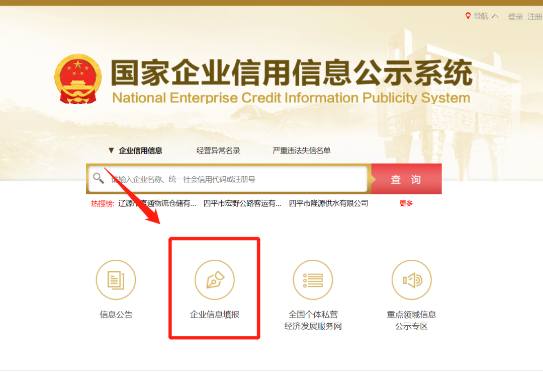 进入“国家企业信用信息公示系统”后,点击“企业信息填报”,选择“登记机关所在地”,进入企业年报