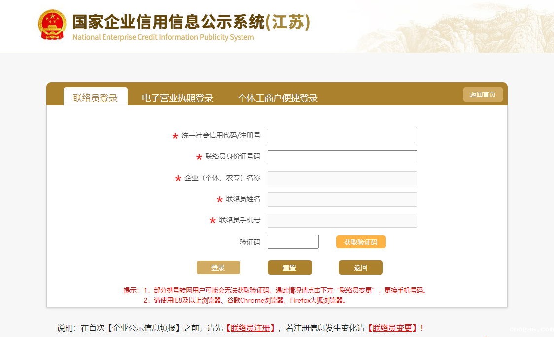 1、在“统一社会信用代码/注册号”栏内填写统一社会信用代码,企业名称会自动弹出,在“工商联络员身份证号码”栏内输入联络员身份证号码,鼠标左键在页面空白处点击一下,3-5秒后,工商联络员姓名及手机号码会自动显示出来,然后点击“获取验证码”,收到验证码后输入,点击“登录”。