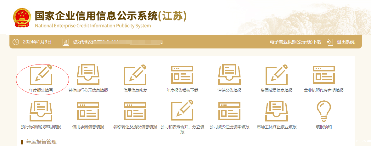 2、 点击左上角“年度报告填写”。