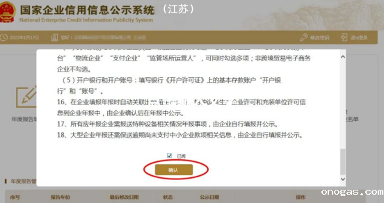 弹出年报须知,阅读后,在下方“已阅”前的小框内“∨”(对勾),再点确认。如果以前存在没有参加年报的年度,先需要将以前年度补报后才可申报本年度的。