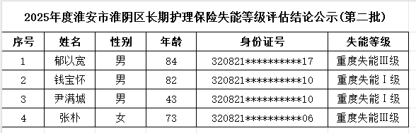 根据《市政府关于印发淮安市长期护理保险实施方案的通知》 (淮政发[2023] 2号) 、《关于印发<淮安市长期护理保险实施细则(试行)>的通知》 (淮政发[2023] 33号) 文件精神,根据《国家医保局办公室 民政部办公厅关于印发<长期护理失能等级评估标准(试行)的通知>(医保办发[2021]37号)》,经评估机构评估,现将淮安市淮阴区长期护理保险失能等级评估的结论公示如下: